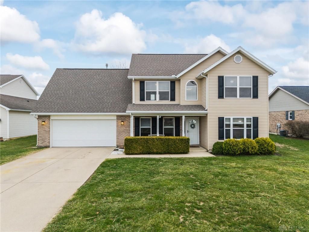 1371 Edinburgh Dr. is move-in ready and located in the highly desirable Kensington neighborhood, where timeless charm meets everyday convenience. Built by David Dodd, this custom home makes a lasting first impression with its attractive brick and vinyl exterior and cul-de-sac location. Start your mornings on the cozy covered front porch, the perfect spot for coffee or quiet conversation. Inside, the main level features updated water-resistant laminate flooring installed in 2023, creating a stylish and durable foundation throughout. The spacious kitchen comes fully equipped with appliances and opens seamlessly to the breakfast area and family room, making it ideal for both daily living and entertaining. A formal dining room with a tray ceiling adds an elegant touch for holidays and special gatherings, while the private main-floor office with French doors offers the perfect work-from-home setup. Upstairs, newer carpet installed in 2023 runs throughout four generously sized bedrooms. The owner’s suite is a relaxing retreat with a vaulted ceiling, walk-in closet, and ensuite bath complete with dual vanities, a soaking tub, and separate shower. The oversized fourth bedroom above the garage offers soaring vaulted ceilings and flexible space for guests, a playroom, or bonus room. Out back, enjoy peaceful views from the patio as the home backs to green space, Kensington Park, and a scenic pond. Tucked on a quiet cul-de-sac yet just minutes from shopping, dining, I-75, I-70, and WPAFB, this home truly offers the best of both comfort and location. Easy to show and even easier to fall in love with.