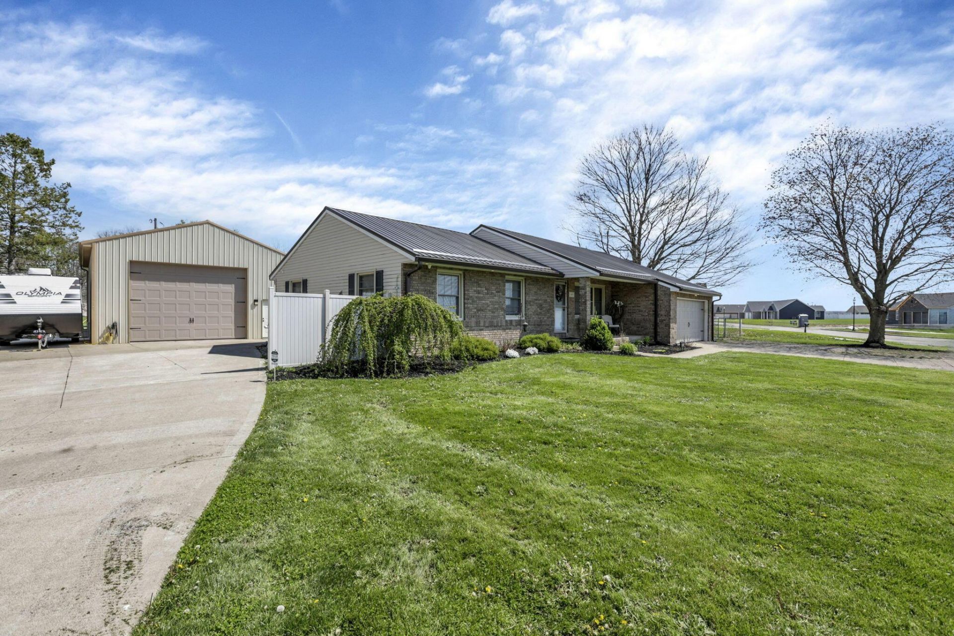 OPEN HOUSE SUNDAY MAY 3rd 11am-1pm Welcome home to this beautifully maintained ranch situated on just over half an acre in the desirable Miami Trace School District. Offering the ease of one-floor living, this 3-bedroom, 2 1/2 bath home blends comfort, functionality, and impressive updates throughout. Step inside to find a spacious living room and a versatile family room/dining room combination featuring a cozy fireplace perfect for gatherings or relaxing evenings. The large kitchen is a standout, boasting abundant counter space, ample cabinetry, all GE slate appliances, and new porcelain flooring that flows seamlessly into the family and dining areas. The owner's suite provides a private retreat with a recently updated en-suite bath, while the hall bathroom has also been refreshed with new flooring. Additional updates include new carpet (2022), new heat pump and A/C (2025), and a new hot water tank (2026). The home is topped off with a brand-new metal roof and gutters (2026), newer windows (approximately 5 years old), and a new well bladder giving peace of mind for years to come. A generously sized laundry room adds convenience with a utility sink, shelving, and extra storage space. One of the true highlights of this property is the impressive 30x36 pole barn, complete with heated floors, its own bathroom, 14-foot ceilings, and a 16' wide by 12' tall garage door, ideal for hobbyists, business use, or storing large equipment. The barn also includes a camper hookup, built-in shelving, and its own private driveway for added accessibility. Enjoy country-style living with no RITA tax, yet remain close to all shopping conveniences and a quick jump onto the highway. This property offers hard-to-find space, updates, and functionality. Don't miss out on this one!