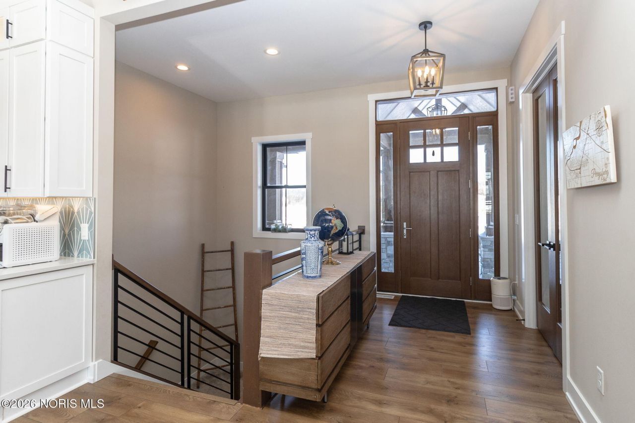 Located in Sanctuary in the Woods, one of Perrysburg's most sought after luxury neighborhoods, this exceptional residence offers a rare blend of refined interiors and resort-style outdoor living. From the moment you enter, natural light fills the open concept main level, where soaring ceilings, custom millwork and expansive windows frame views of the private backyard retreat. Designed for both everyday living and elevated entertaining, the chef's kitchen features premium appliances, high end cabinetry, generous prep space, and a walk-in pantry, seamlessly flowing into the great room and dining areas. The primary suite offers a true escape, complete with a spa inspired bath, heated floors, and a custom walk-in closet. Additional bedrooms provide flexibility for family, guests, or work from home needs, with the fourth main level bedroom currently serving as a dedicated office. The finished walkout lower level adds 1,694 square feet of additional living space, bringing total livable square footage to 4,557 square feet, including the finished lower level. Whether hosting gatherings, accommodating guests, or creating a private retreat, this level offers a large recreation area, bar or kitchenette, additional bedroom with egress window, full bath, and abundant storage. Step outside and the experience truly transforms. More than $300,000 has been thoughtfully invested into creating a backyard designed to rival a private resort. The custom 42' x 18' saltwater pool (3-8 ft depth) with Pentair filtration system, automatic leveler, and safety cover is framed by an architectural wall featuring dual waterfalls and striking fire and water bowls. Expansive stamped concrete patios, curated landscaping with sculpted mounds, irrigation system, fencing, fire pit and hot tub create layered outdoor living spaces ideal for both quiet evenings and unforgettable gatherings. Homes that offer this level of outdoor design and investment are rare and increasingly difficult to replicate. Additional features include Lutron lighting and automated shades throughout, a tankless water heater, and access to the highly regarded Perrysburg School District. Just minutes from shopping, dining, and commuter routes, this home delivers luxury, privacy, and lifestyle in one exceptional offering.