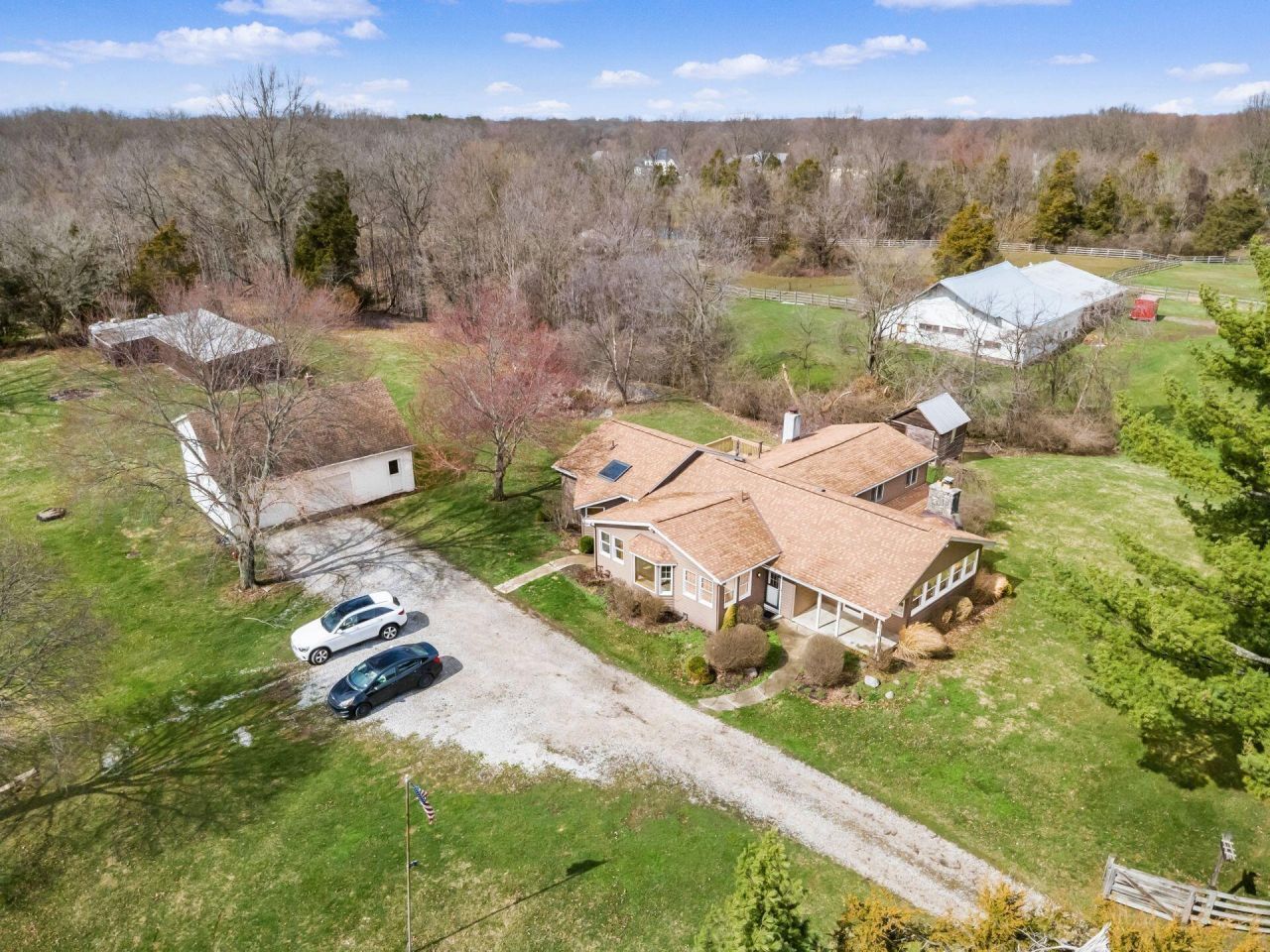 This 3-bedroom, 3-bath home sits on a gorgeous 2.5 acre scenic lot and offers a great value-add property with strong renovation opportunity--bring your vision and restore it to its full potential! Oversized, eat-in kitchen, 3-season room, spacious primary suite with cathedral ceiling and private full bath with soaking tub and skylight, a family room featuring a wall of windows, plus two hidden staircase entrances that add unique character to this home. The finished walk-out basement includes a wet bar and outside you'll find an oversized two-story garage and workshop, a pole barn, and a shed, with a creek at the property line; the detached garage also includes an upper-level apartment space ready to be finished to your specifications. Olentangy Schools!