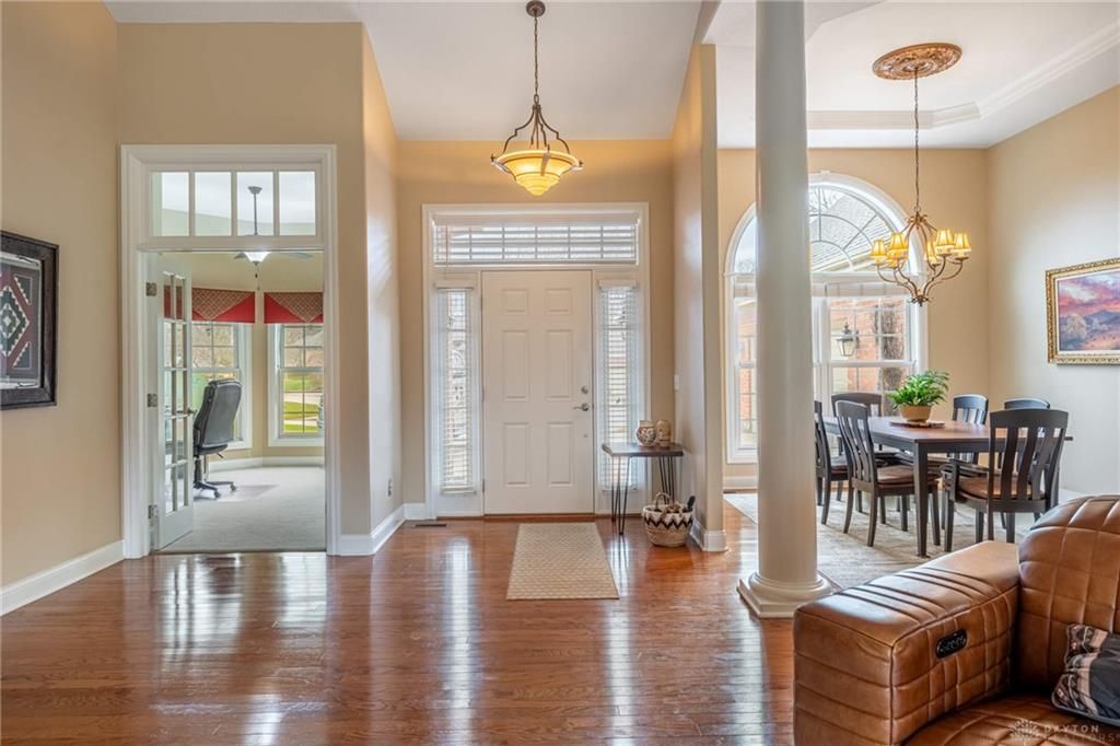 This classic all-brick ranch home by Michaels Custom Homes is situated on a quiet cul-de-sac and offers a spacious split floor plan. The residence features three bedrooms and two bathrooms with a focus on single-level accessibility. The Great Room serves as the central hub, featuring high cathedral ceilings and wide-arched transitions that flow into the kitchen and dining areas. The kitchen opens to a breakfast nook and is equipped with bar top seating, recessed lighting, a walk-in pantry, and cabinetry featuring plenty of drawers for storage. For formal occasions, the spacious dining room features a distinctive tray ceiling. The primary suite is located in its own section of the main floor. This bedroom features tray ceilings and an attached bathroom with a dual vanity, a large walk-in closet, and a tiled shower alongside a Jacuzzi soaking tub. Two additional bedrooms and the laundry room are also positioned on the main level. A significant functional feature is the 14x24 finished bonus room located above the garage, providing extra square footage for a hobby space or guest area. Interior finishes include a combination of durable ceramic tile in the entry foyer and high-traffic hallways, with high-quality wall-to-wall carpeting in the living areas and bedrooms. The home includes a dedicated office off the main foyer, offering a quiet setting with natural light. Exterior features include a recently upgraded three-season room with newer double pane windows. This space leads to an oversized patio designed for outdoor dining or a grill station. The lot features mature landscaping, ornamental trees, perennial beds, and a functional irrigation system. Located within minutes of I-675, the property provides efficient transit to Wright-Patterson Air Force Base, downtown Dayton, and local amenities including Sugarcreek MetroPark and The Greene shopping center.