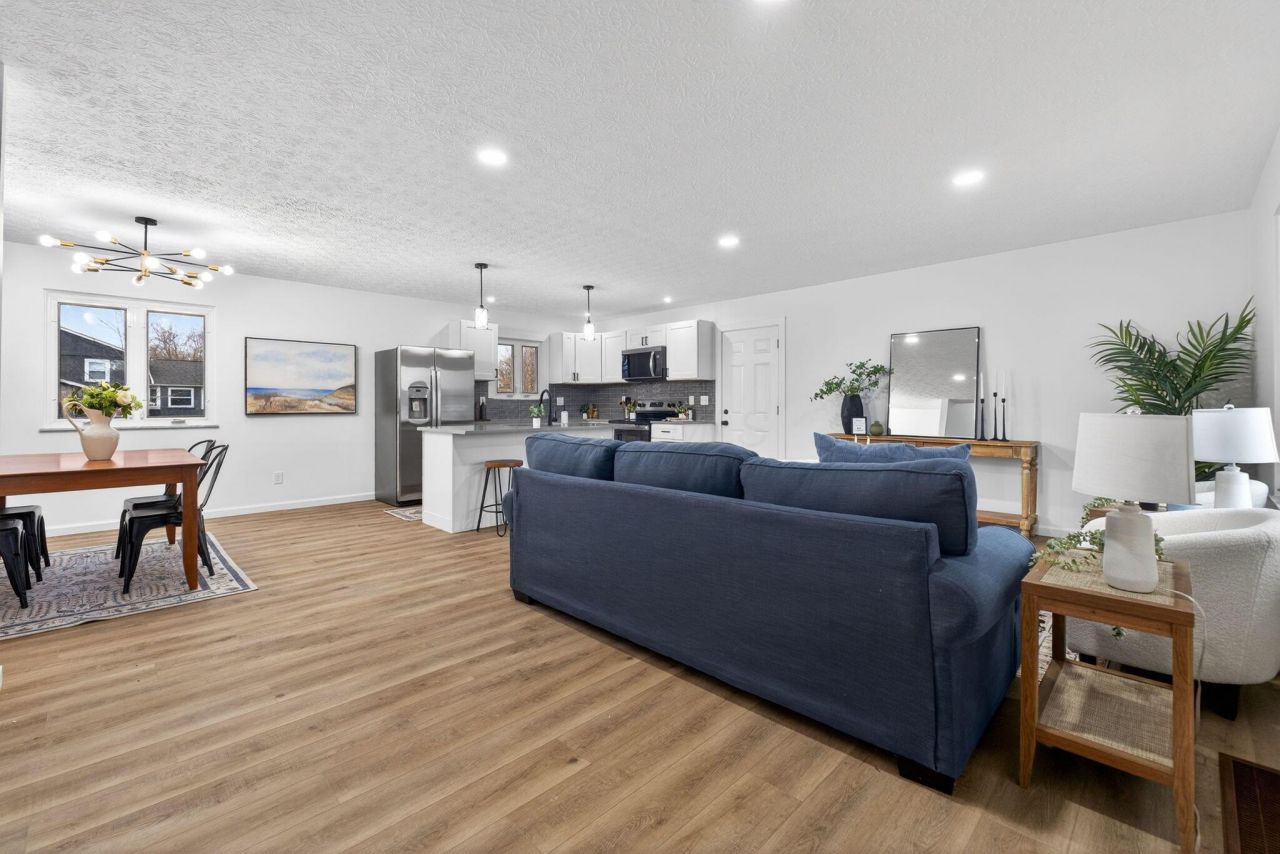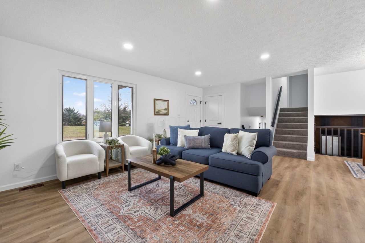Fully remodeled 4-bedroom, 2.5-bath split-level home offering modern finishes and flexible living space throughout. The main level features durable luxury vinyl plank flooring, recessed lighting, and an open-concept layout that flows seamlessly into the updated kitchen with white cabinetry, stainless steel appliances, tile backsplash, center island with seating, and contemporary lighting???ideal for both daily living and entertaining.The lower level provides a comfortable secondary living area highlighted by a striking brick fireplace with a custom wood accent wall, along with a built-in bar area that makes the space perfect for hosting, game nights, or a media room. This inviting level offers excellent versatility for relaxing or entertaining. Bathrooms have been fully updated with stylish vanities, modern fixtures, and bold tile selections, including a sleek black tile tub surround. Bedrooms are well-sized with ample closet space, and the split-level design offers privacy and functionality.Step outside to enjoy the roofed patio overlooking a beautiful lot with room to entertain or unwind. Additional highlights include a 2-car garage and fresh updates throughout, making this home move-in ready. A great opportunity to own a thoughtfully renovated home with both indoor and outdoor living spaces.
