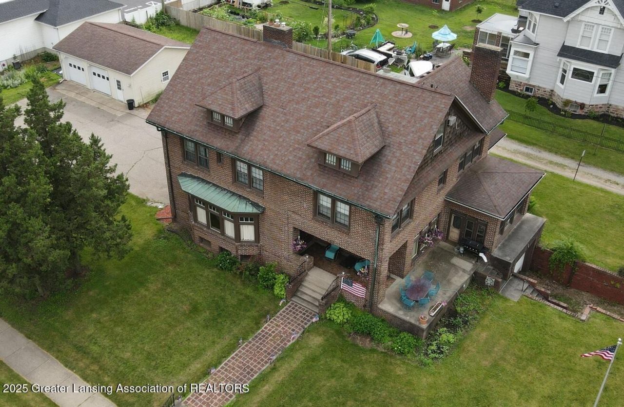Youve driven by it for years-now is your chance to own this iconic 1927 5-bedroom, 2-full+2-half bath brick beauty in the heart of Eaton Rapids. This historic home is full of charm and craftsmanship, featuring stunning woodwork, a grand staircase, built-ins, 1st floor laundry and a tank-less water heater. The spacious living room boasts beamed ceilings, large bay window and a fireplace. The kitchen includes a 6-burner gas stove, eat-in space and adjacent breakfast nook. The brick-floored 3-seasons room is a serene space for unwinding or creating a vibrant plant haven. The finished 3rd story, full basement, attached garages plus a 2+car detached garage provide endless possibilities for hobbies & storage. This admired home, rich with history and heart, is ready for you to make it your own