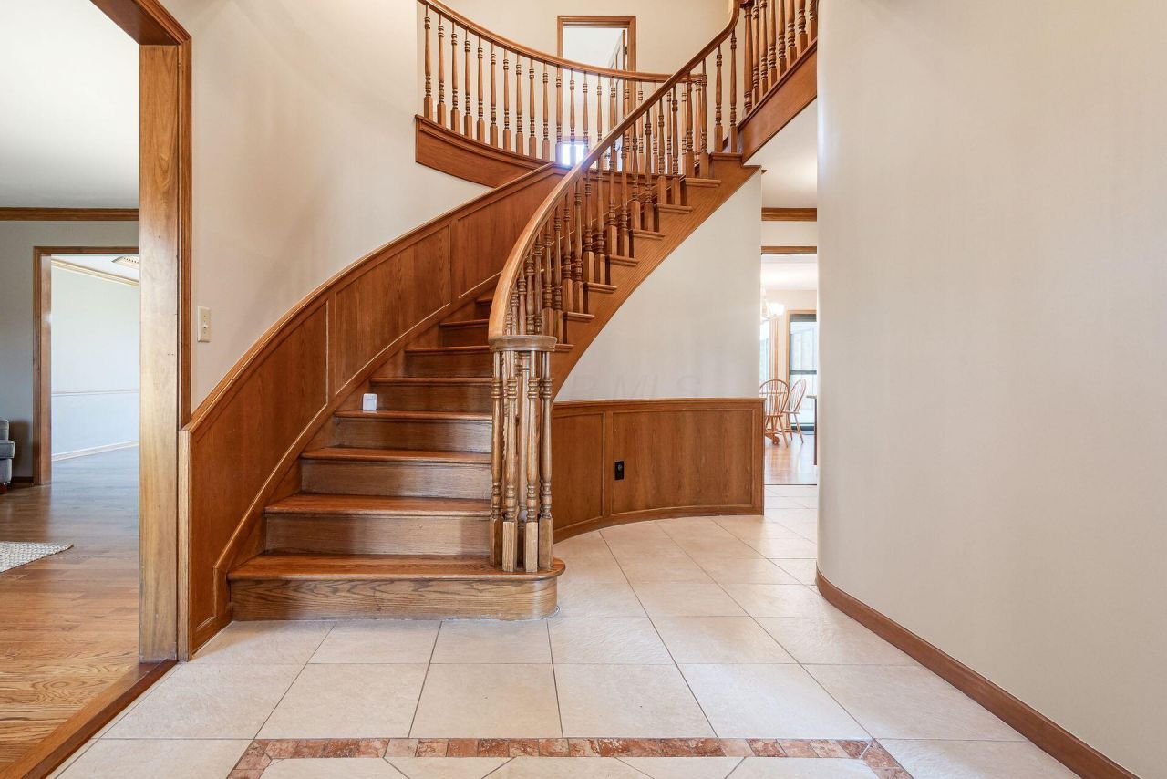 Over a half acre lot in Muirfield backing to trees! Pull up the concrete drive and into this stately brick front home. Plenty of room for cars on the wide drive or in the spacious 3 car sideload garage! Hardwood floors and a beautiful bridal staircase greet you when entering the home. The island kitchen opens to the vaulted great room with a 2nd set of steps & a floor to ceiling brick fireplace. There is also a cozy sunroom out back, a perfect place to relax in the warmer months! Main level has a full bath adjacent to the office and could be converted into a mother in law suite if desired. Upstairs are four large bedrooms plus a nursery (5th Bedroom) and a loft-the space is there for another bedroom or to add a 2nd private office or playroom! The finished lower level has plenty of rec space and includes a full bath. Out back is a newer patio that backs to a wall of trees. With almost 5000 sf of living space, this is a perfect spot in Muirfield to call home! Easy access to more than 29 miles of bike paths, 2 swimming pools and 2 sets of tennis courts!