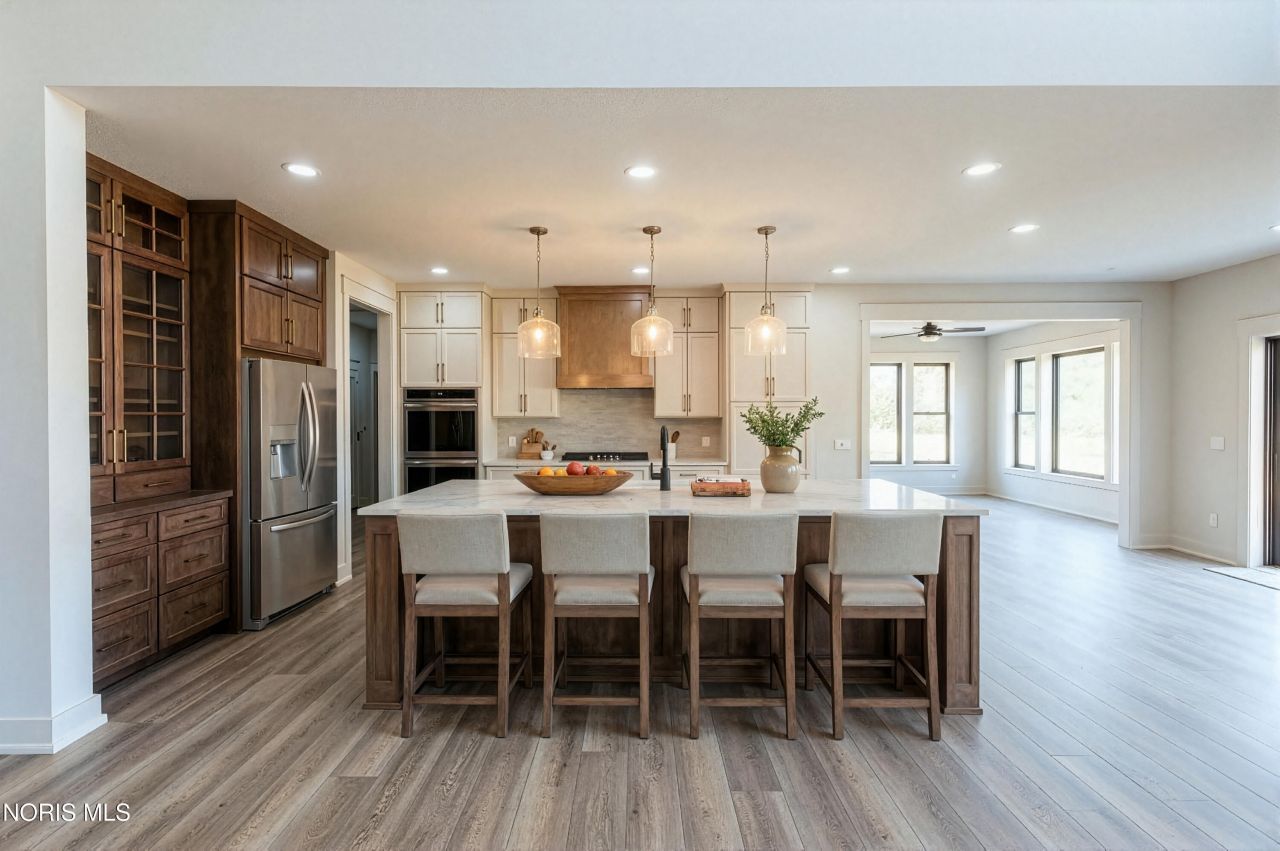 This just completed, move-in ready home was designed, interior-designed, and built by award-winning and high-end custom builder, Homes by Josh Doyle. This new construction custom home offers the highest level of structural quality and energy efficiency. Features include ½ closed cell spray foam exterior walls with fiberglass batt insulation & R-50 ceiling insulation (perfect for rising energy costs!), 4000 PSI concrete w/ fiber mesh foundation walls, premium-grade studs and OSB, and top-tier basement drainage and waterproofing systems. This quality is un-matched in the industry for spec homes. The layout is a perfected 'master class' custom home design specifically for this lot. NOT COOKIE CUTTER. Learn more about the quality on the How We Build page of their website. Contact directly to do a 3D walk-through of the home to visualize interior finishes and layout in a virtual meeting or in-person at HQ in Whitehouse, Ohio. Location / Lot This residence is situated in the highly sought-after Brookside Sylvania Subdivision in Sylvania, OH. Homes by Josh Doyle will be designing and constructing distinctive custom homes in this premier community, offering stunning streetscapes and beautifully planned surroundings. Full yard irrigation is included with this house. Layout This home features an incredible 3,562 total sq. ft. layout with 9' first-floor ceilings and a highly desirable first-floor primary suite. The main floor boasts an open-concept design that flows seamlessly from the kitchen to a stunning two-story great room and a large sunroom. Elegant full-arch drywall openings lead into the sunroom, mudroom, and primary wing. A private den is located on the first floor, accessed by custom stained double doors with clear glass. The primary suite is a true retreat with a walk-in closet, a custom tile shower, double sink vanity, and a luxurious freestanding Kohler soaking tub. The kitchen features a large, fully finished walk-in pantry hidden behind matching cabinet doors. Upstairs, you will find 3 additional bedrooms, a spacious loft, 2 full bathrooms, and a massive bonus room. The everyday entrance from the 3-car garage leads into a dedicated entry area with custom painted built-in lockers, a half bath, and a laundry room. Finishes EXTERIOR: Andersen windows with grids on the front, a Therma-Tru front door with a clear glass transom, and black Clopay long-panel garage doors. The striking exterior features cement board siding and matching painted board-and-batten on the front, contrasted by vinyl siding. Stained cedar gable trusses, stained cedar porch columns, and thin brick accents, make this home look VERY custom. INTERIOR: 2-toned custom cabinets, a custom wood hood, and a built-in hutch shine with a quartz countertop and Champagne Bronze hardware. A hidden cabinet door opens to a fully finished walk-in pantry. The laundry room pops with custom cabinets, while the bathrooms feature custom vanities, quartz countertops with undermount sinks,